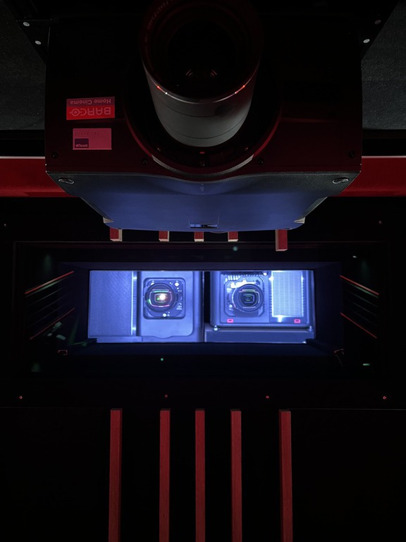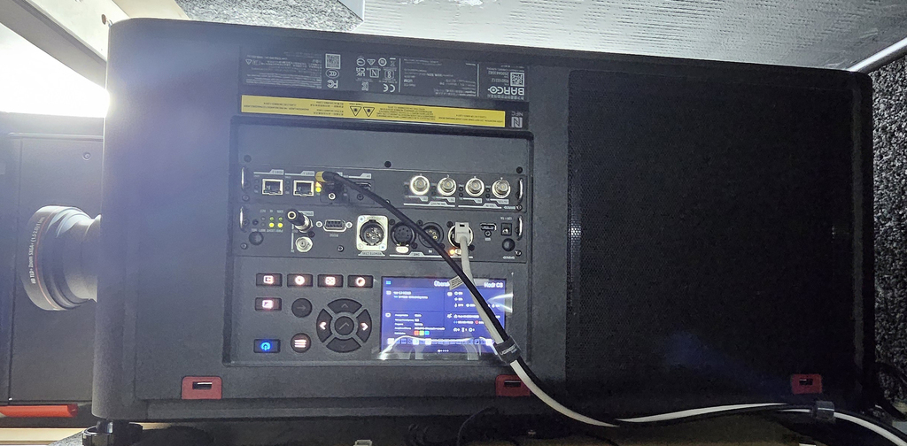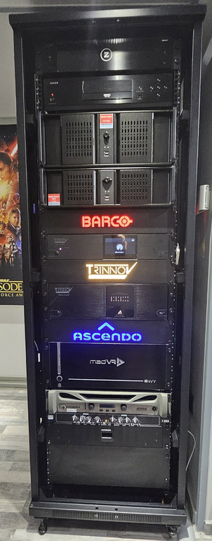 Nun sind der Barco Hodr CS und der madVR Envy Extreme bei unserem Kunden in den separaten Technikraum seines 7,20 m langen und 5,50 breiten Heimkinos eingezogen, und projizieren ein fantastisches Bild auf die 4,10m breite 21:9 Stewart Leinwand.
